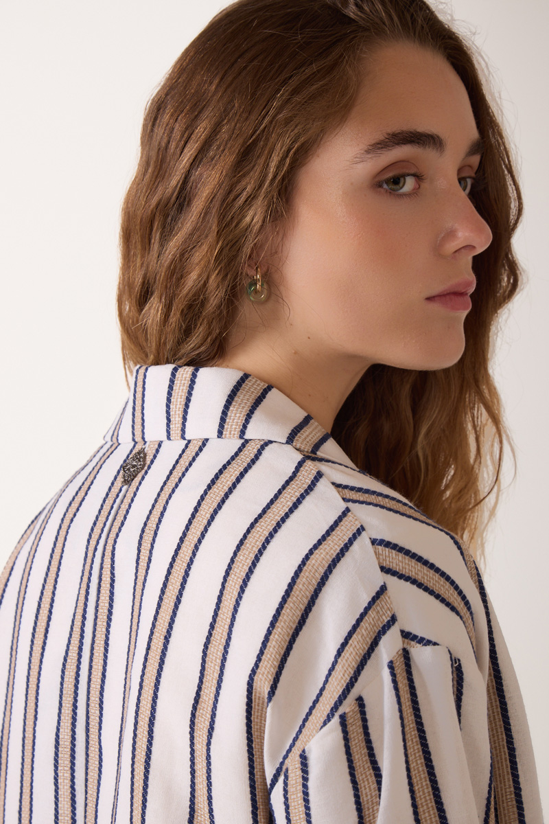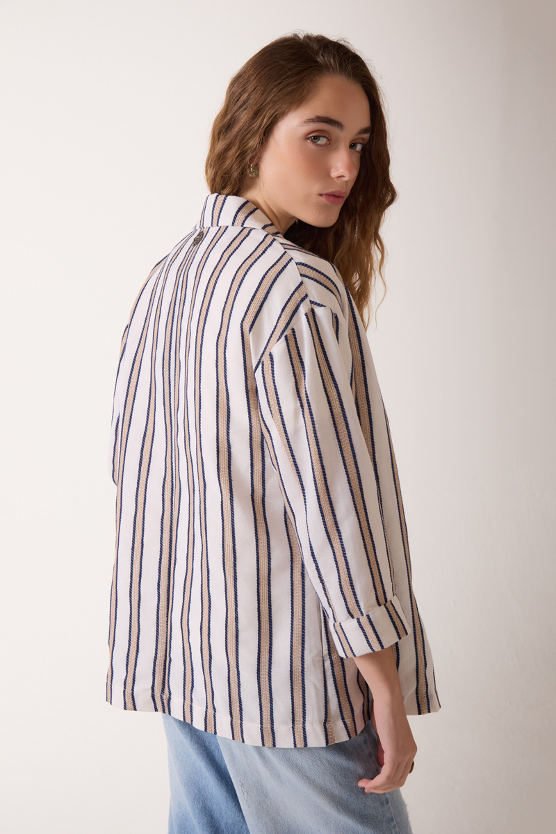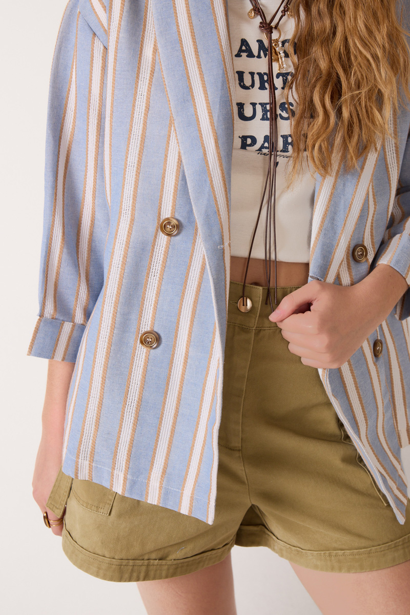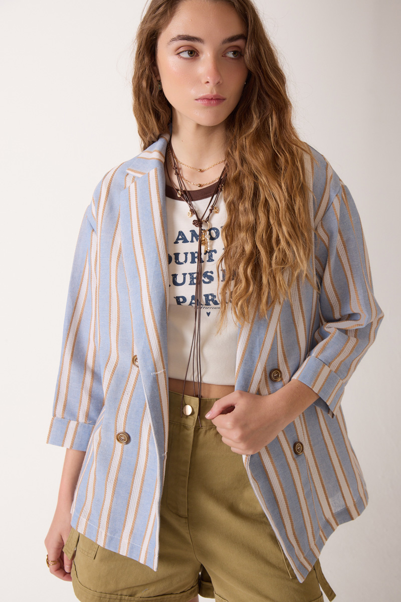 Blazer sastrero de silueta relajada con mangas anchas y botones ocultos en cartera, un ítem versátil y sofisticado que eleva cualquier look. Confeccionado en lino rayado, aporta frescura y un estilo actual con aire mediterráneo. Su diseño combina elegancia y comodidad, ideal para usar tanto en el día como en la noche.